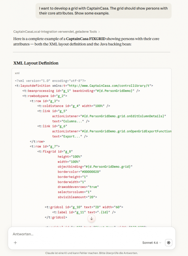 After changing the configuration you have to deeply restrat Claude desktop (meaning: completely stop Claude within the task manager…) – and then can ask Claude about CaptainCasa. It is important to tell Claude that a question is CaptainCasa related – so that it knows to request for information via the MCP interface. So embed the word “CaptainCasa” in your initial prompt.