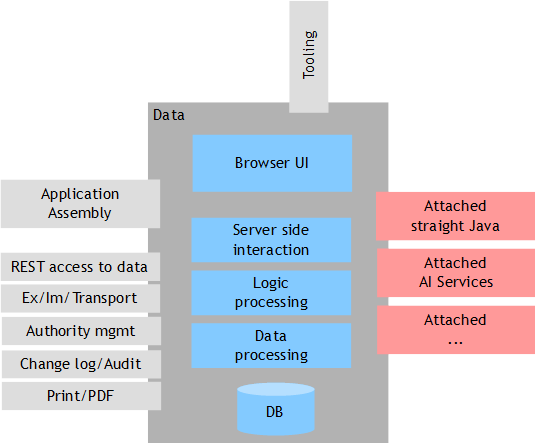 RapidApp creates the entrance points on view, controller and data level which you can use for plugging own logic into. The own logic is added as Java code – there is no limit of flexibility as result.